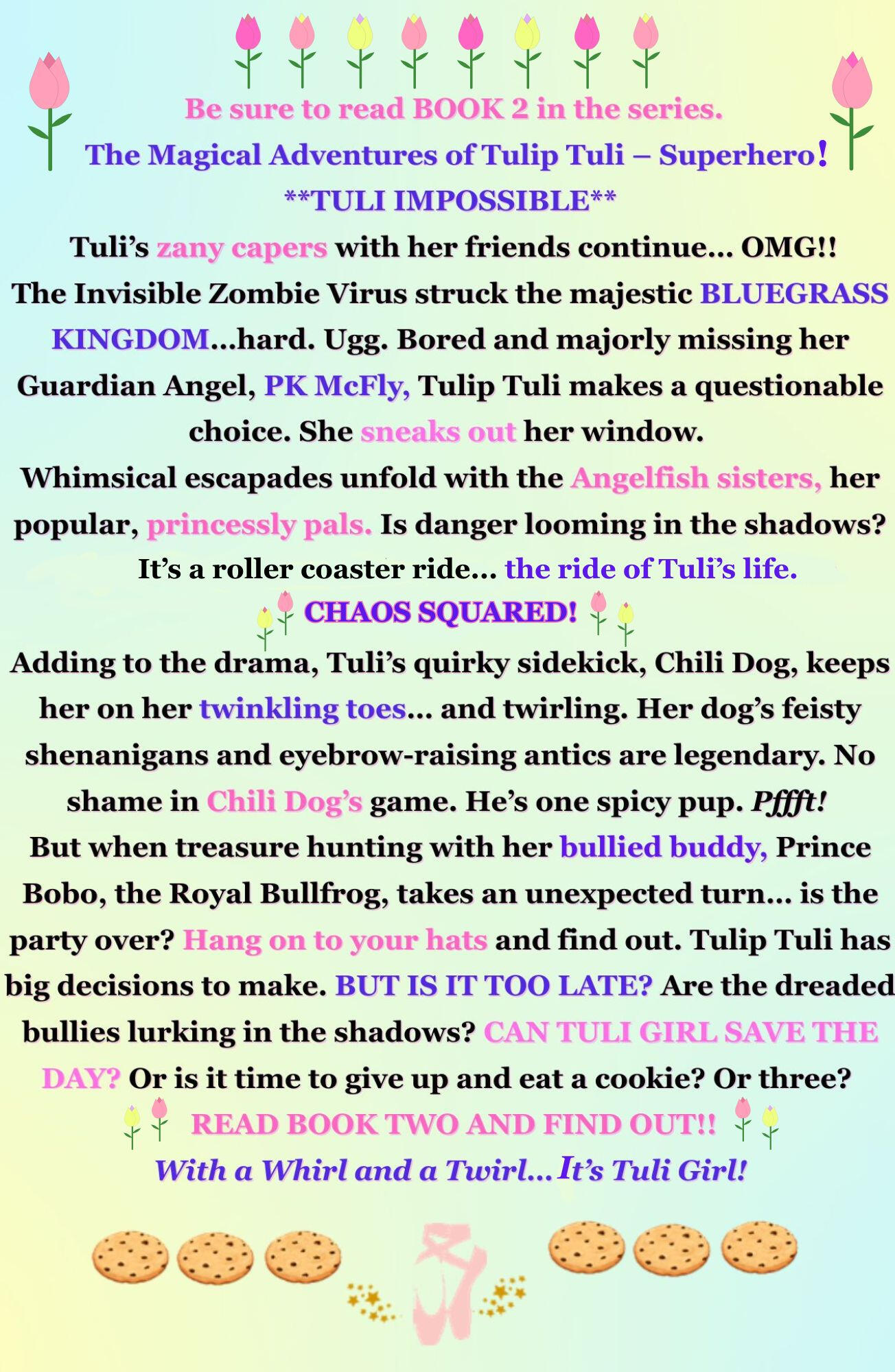 Sign up here for exclusive Tulip Tuli Superhero updates, new adventures, and more. She just might write a Hip-Hop song or a poem. She designs cool jewelry and invents superhero cookies, with top-secret magical sprinkles. Tuli whips up magical fingernail polish, lip gloss, and eye shadow. She has her own magical 'Happy in a Bottle' perfume. Mostly, Tulip Tuli loves sharing 'The Kindness' with other amazi-dazing, 'ImPerfectly Perfect' Superheroes. She would love to hear from you.